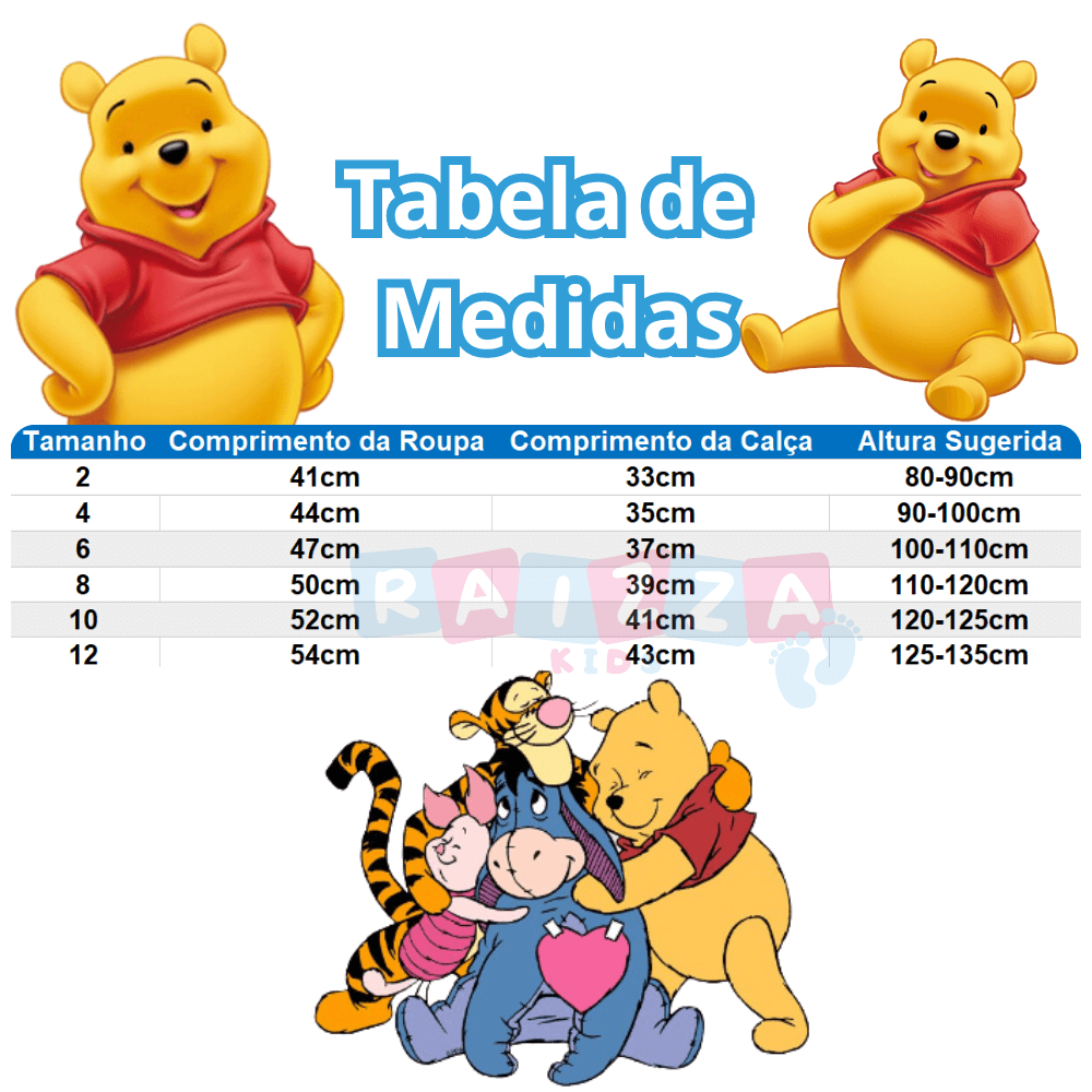 - Estampa Ursinho Pooh: O clássico personagem Pooh estampa o pijama, encantando as crianças com seu design carinhoso e divertido.